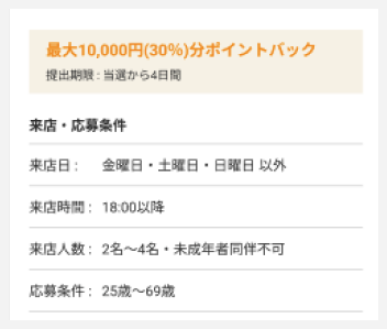 獲得できるポイントや来店時間・来店人数・年齢などに条件があるので、しっかりとチェックしていきましょう。条件がマッチしたら早速応募!