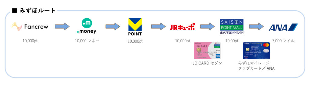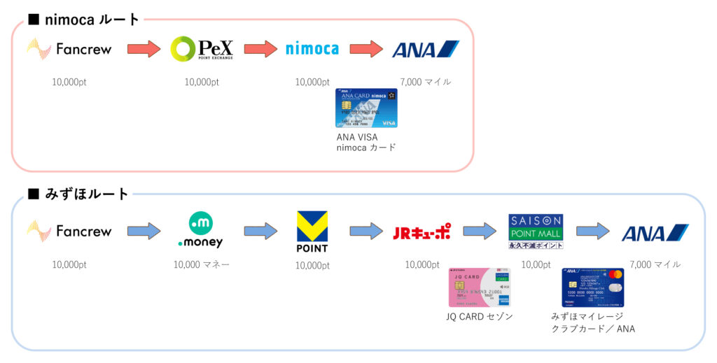 ファンくるのポイントをANAマイルに交換するには、nimocaルートみずほルートの2つのルートがあります!交換率は最大70%で、ANAマイル還元率最大のおすすめの交換ルートです。
