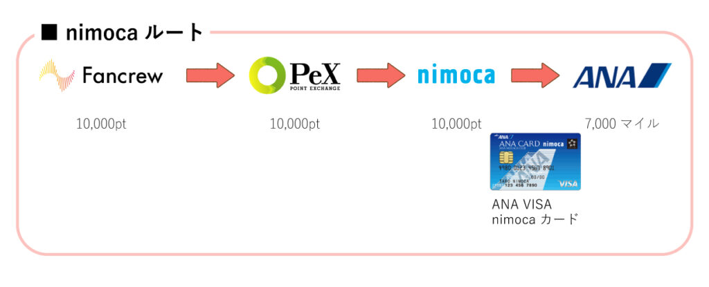 ファンくるポイントをPexポイント→nimocaポイントに変えて、最後にANAマイルへ交換するルートです。交換率70%交換回数は3回なので比較的手間がかからず、交換に必要な日数は約3週間~1ヶ月半です。