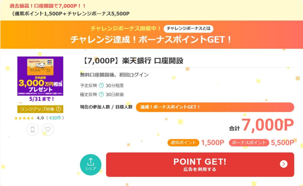 例えば、「楽天銀行」の口座開設を申し込むと今なら7,000ptもらえます。