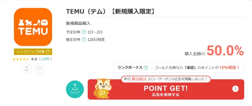 例えば、「TEMU」で新規購入を行うと今なら購入金額の50%のポイントがもらえます。