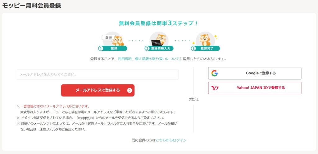 メールアドレス、もしくはGoogle、Yahoo! JAPAN IDで登録を行います。
