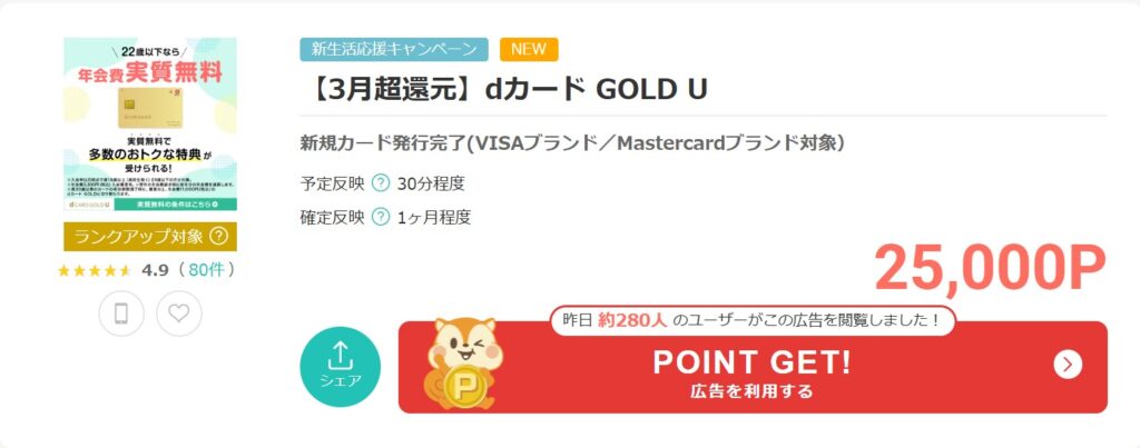 例えば、「dカード GOLD U」を申し込むと今なら25,000ptもらえます。
