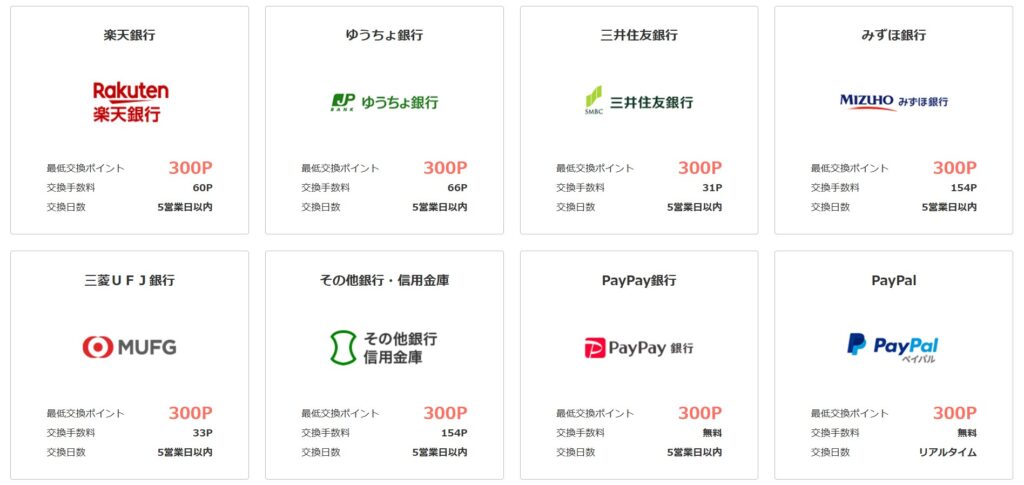 VポイントやGポイントなどの他社ポイントに交換できるのはもちろん、楽天銀行や三井住友銀行への口座振り込みで現金に交換したり、PASUMOやSuicaなどの交通系ICカードの電子マネーに交換することもできます。