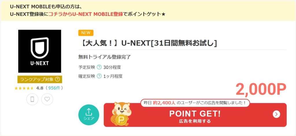 「U-NEXT」の31日間無料お試しに申し込むと、今なら2,000ptもらえます。
